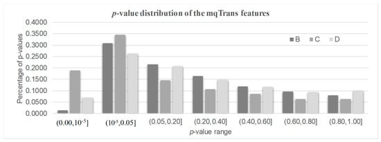 The distribution of the p-values of the mqTrans features in all three testing datasets. The 30% healthy controls and 100% lung cancer samples of dataset GSE33356 constitute dataset B. Datasets C and D represent datasets GSE18842 and GSE30219.