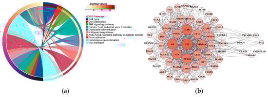 Lung cancer differentially expressed gene enrichment analysis and PPI network analysis of 13 dark biomarker genes. (a) The left side of the figure displays the top ten pathways from the KEGG enrichment analysis results. Specifically, we selected 54 genes in the TNF signaling pathway. (b) On the right side, the protein–protein interaction (PPI) analyses yield results indicating that seven dark biomarkers have node interactions with lung cancer significant difference genes.