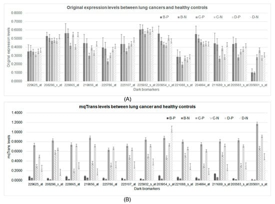 Comparison of the 13 dark biomarkers from both the original expression and mqTrans levels. (A) The original expression levels and (B) the mqTrans levels of these 13 dark biomarkers are displayed. The two strong dark biomarkers are on the left-most part. The horizontal axis lists the 13 dark biomarkers. The vertical axis illustrates the values of the respective feature levels. The data series B-P and B-N are the lung cancer and healthy control samples in dataset B. The other four data series, C-P, C-N, D-P, and D-N, are defined for the lung cancer and healthy control samples in datasets C and D, respectively.