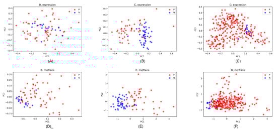 PCA dot plots of the 13 dark biomarkers on the original expression and mqTrans levels in the three datasets. The first and second principal components (PC1 and PC2) are used as the horizontal and vertical axis. The lung cancer and healthy control samples are colored as red (P) and blue (N). The PCA dot plots of the original expression levels are for datasets (A) B, (B) C, and (C) D. The PCA dot plots of the mqTrans levels are also generated for the three datasets (D) B, (E) C, and (F) D.