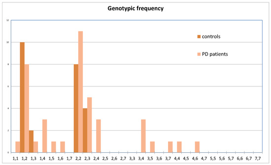 Genotypic frequency distribution using haplotypes of the ATG16L1 promoter gene. The X-axis indicates all possible genotypes after matching the seven (numbered from 1 to 7) haplotypes found. The Y-axis shows the absolute frequencies of such genotypes.