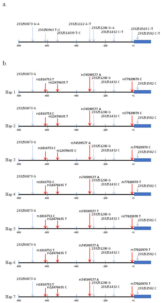(a) SNPs identified in controls and PD patients according to Wang et al. [22]. (b) Schematic of all seven haplotypes showing the sequence variants in the promoter of the ATG16L1 gene identified in this study. The red arrows indicate the SNPs found in this study within each haplotype.