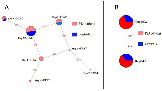 In our NetWork analysis, each haplotype was represented by nodes connected by one single-mutation character from the nearest ones (Figure 3). All these nodes were plotted on the tree proportionally to the allele frequency of each node using the total data set. In addition, to describe the haplotypes in the nodes belonging to the different population groups of control or PD patients, they were assigned colour codes proportional to their allele frequency (Figure 3). According to our results, only haplotypes hap4, hap5, hap6, and hap7 were found exclusively in patients diagnosed with PD, sharing a T in SNP rs77820970. The remaining haplotypes were present in the controls and patients but appeared in their nodes with similar proportions.