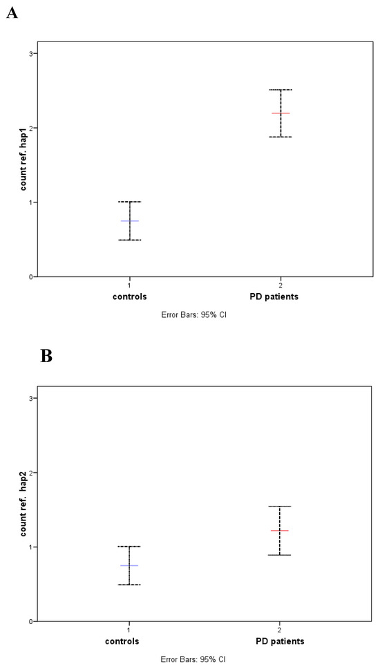 Comparison of averaged cumulative counts in controls (1) versus patients (2) against reference genotypes carrying homozygous hap1 (A) or homozygous hap2 (B). The error bar corresponds to the 95% confidence interval. Blue and red lines for the mean in controls and patients, respectively.