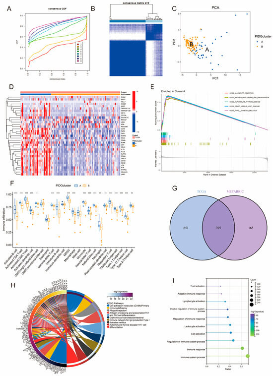 Molecular subtyping based on PIDGs features. (A–F) Consensus clustering results of TNBC patients in TCGA. (A) Cumulative distribution function plot of consensus clustering. (B) Heatmap of consensus clustering for k = 2; (C) PCA showing the distribution of PIDGs subgroups. (D) Expression level distribution of 35 PIDGs among different subgroups. (E) GSEA shows molecular functional differences among PIDGs subgroups. (F) Differences in immune cell content among different PIDGs subgroups (*, p < 0.05; **, p < 0.01; ***, p < 0.001). (G) Venn diagram of the significance analysis of PID clustering in TCGA and METABRIC cohorts. (H) KEGG enrichment analysis of differentially expressed genes. (I) GO enrichment analysis of differentially expressed genes.