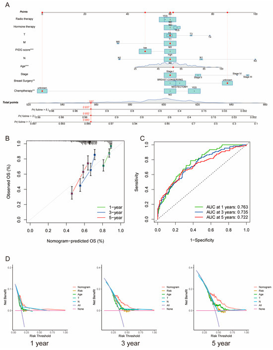 We utilized PIDG score along with clinicopathological variables such as patient age, chemotherapy, hormone therapy, radiotherapy, breast surgery, staging, tumor size (T), lymph node status (N), and distant metastasis status (M) to construct a nomogram for predicting one-, three-, and five-year OS. PIDG score, patient age, and breast surgery were identified as independent prognostic factors for TNBC (Figure 4A).