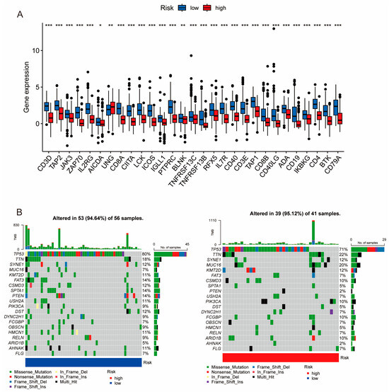 Expression levels of PIDGs and mutation landscape in different PIDG score groups. (A) Analysis of PIDGs expression levels in high- and low-risk groups based on PIDG score. (B) Mutation landscape in high- and low-risk groups based on PIDG score. (*, p < 0.05; **, p < 0.01; ***, p < 0.001).