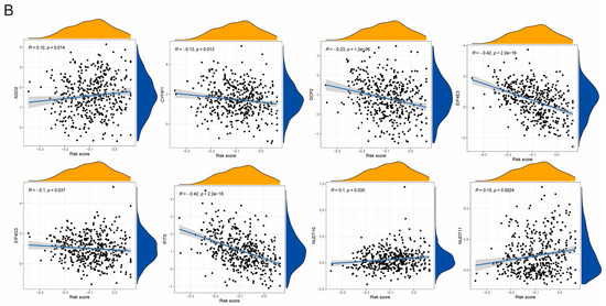 RNA modification is an emerging mechanism in gene regulation. This reversible post-transcriptional modification is regulated by “writers” (methyltransferases), “readers”, and “erasers” (demethylases), influencing various molecular functions [27,28,29]. Common RNA modifications include m6A, m5C, m1A, and m7G [30,31,32]. Recent advances in epi transcriptomics have revealed the functional associations between RNA modification and various human diseases [33], and studies have suggested that RNA modification may be improperly regulated in human cancers, making it a potentially ideal target for cancer therapy [34,35,36]. To better understand the regulatory mechanism of PIDG score concerning various methylation levels, we collected the genes related to m1A, m5C, m6A, and m7G modifications and performed correlation analyses with the model genes. We found the highest correlation with m7G (Figure 6A). Additionally, we observed that the PIDG score were positively correlated with AGO2, NUDT10, and NUDT11 in m7G modification while negatively correlated with CYFIP1, DCP2, EIF4E3, EIF4G3, and IFIT5 (Figure 6B). We also identified some correlations with other methylation modifications, such as the positive correlation of the PIDG score with TRMTG1A and YTHDF1 in m1A modification (Figure S4A), the negative correlation of PIDG score with NSUN3 in m5C modification (Figure S4B). In the case of m6A modification, PIDG scores were positively correlated with YTHDF1 while significantly negatively correlated with IGFBP2, HNRNPA2B1, YTHDC2, WTAP, RBM15, and IGF2BP3 (Figure S4C).