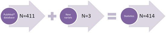 Genotype–phenotype correlations: methodologic flow chart. We included N = 411 already published cases (index patients with defined genotype and phenotype) and N = 3 novel variants from our in-house database with defined phenotypes. All index cases (N = 414) were statistically processed using Fisher’s exact test.