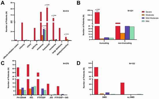 Genotype–phenotype correlations in XLMTM. (A) Type of disease-causing variant in the MTM1 gene vs. phenotype: frameshift, nonsense, and in/del variants are significantly associated with a severe phenotype, as well as missense variants significantly correlating with the mild or moderate phenotype; (B) truncation vs. phenotype: truncating variants are significantly associated with the severe phenotype; (C) MTM1-specific domain vs. phenotype: there is no significant difference between specific domain and phenotype severity; and (D) nonsense-mediated mRNA decay (NMD) vs. phenotype: there is no significant difference between nonsense-mediated mRNA decay and phenotype severity.