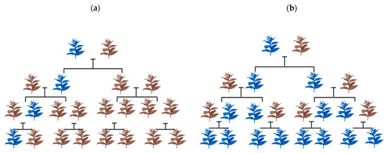 Spread of the allele containing the drive in a population. (a) Normal inheritance pattern in the absence of a drive allele. (b) Gene drive-mediated inheritance, where the altered gene bias influences the inheritance pattern. The brown plant represents the wild type of individual while the blue represents the individual with the gene drive allele.