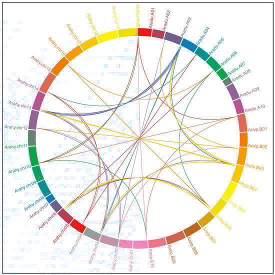 The MCScanX toolkit [65] was used to search for duplication and synteny in a cross-species manner for three species (A. duranensis, A. ipaënsis, and A. hypogaea), using the collinear relations to plot the synteny graph. The output from McScanX was formatted using an in-house script (https://github.com/lbi-cenargen, accessed on 10 August 2023) to retrieve all syntenic genes from CHS and STS gene families and produce an input file for the circa visualization software v1.0 (OMGenomics; http://omgenomics.com/circa/, accessed on 20 August 2023).