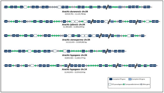 Schematic representation of STS gene clusters organization on chromosomes 04 and 14 of Arachis spp. Right and left arrows indicate whether genes or transposable elements are located on the + or − strand, respectively.