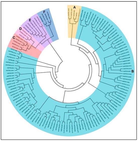 Overall, CHS and STS subclades comprise proteins from the four Arachis species located in similar positions on the chromosomes. For instance, some subclades are formed by proteins encoded by genes with sequential positions on chromosome 04 of the different species, like that comprising AhSTS7, AdSTS6, AdSTS9, AsSTS8, and AsSTS10. Likewise, subclades are formed by proteins whose genes have similar positions on chromosomes 04 and 14 but are located outside of the STS gene clusters (Figure 3), like the one comprised of AhSTS2, AsSTS2, AdSTS1, AiSTS2, and AiSTS3, (chromosome 04) and AhSTS20 and AhSTS21 (chromosome 14; Figure 4). Interestingly, the subclade formed entirely by STS proteins located at chromosomes 01 (AhSTS1, AsSTS1, and AiSTS1) and 11 (AhSTS19), also includes an STS pseudogene from A. duranensis (AdSTS*; Figure 4). Conversely, a unique subclade comprises sequences (AiSTS10, AiSTS11, AhSTS28, and AhSTS29) coding by genes exclusively located on the STS clusters in chromosomes 04 and 14. Vannozzi et al. [18] also observed that grapevine STS proteins encoded by genes located on different chromosomes formed separate clades. Here, only few clades are composed by Arachis proteins encoded by genes located on different chromosomes, such as AhSTS4 located at the STS cluster in chromosome 04 that was grouped with AhSTS40 and AhSTS43 located on the chromosome 14, and AhSTS45 on chromosome 16.