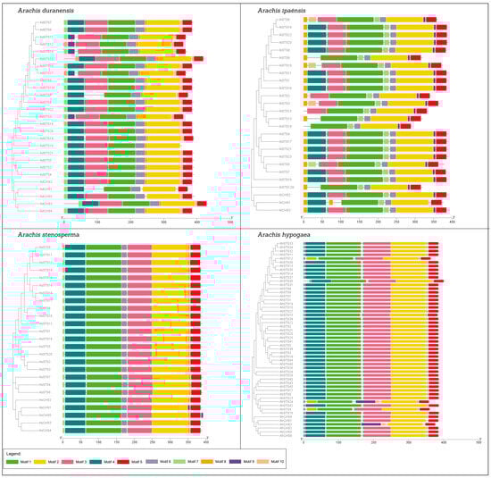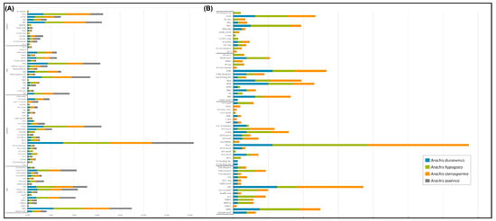For the analysis of cis-acting regulatory elements, the sequence of 1500 nucleotides upstream of the translation initiation codon of each CHS and STS gene from A. duranensis, A. ipaënsis, A. stenosperma, and A. hypogaea was retrieved from Phytozome (https://phytozome-next.jgi.doe.gov/, accessed on 30 August 2023) and PeanutBase (https://peanutbase.org/home, accessed on 30 August 2023) databases.