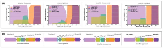 The physical organization of the STS clusters on chromosomes 04 and 14 of Arachis spp. was predicted using the GBrowse tool from PeanutBase (http://peanutbase.org/, accessed on 10 July 2023), accessed on 21 July 2023. To search putative transposable elements (TEs), the mixed repeats sequences from A. ipaënsis, A. duranensis, and A. hypogaea identified by [21] were used as a query for BLASTn search against the genome sequence of each STS cluster. The distribution and orientation of STS, CHS, TEs, STS pseudogenes, and other functional genes within each cluster were then arranged using SnapGene® software v5.0.8 (https://www.snapgene.com, accessed on 25 July 2023).