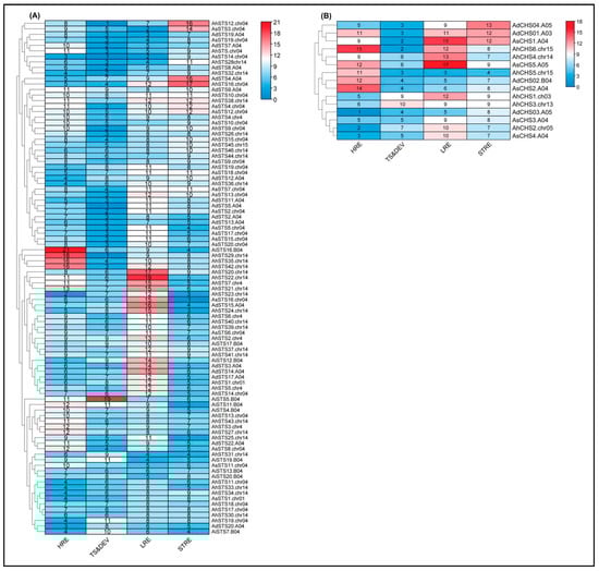 Figure 7A,B shows the relationships between the STS and CHS genes, respectively, based on the observed numbers of cis-elements classified in the HRE, LRE, STRE, and TS&DEV categories. Regulatory elements belonging to the four categories were found in all putative promoter sequences analyzed, allowing the identification of promoter clusters based on the differences in the number of elements in each category. For instance, the first group (AiSTS16, AhSTS29, AhSTS35, and AhSTS42) showed the greatest number (>16) of elements related to hormone response (HRE), while a second group with eight sequences (AhSTS20, AhSTS22, AhSTS7, AhSTS21, AhSTS23, AsSTS16, AdSTS15, and AhSTS24) showed the highest number (>12) of light-responsive elements (LRE). Four genes (AhSTS12 and AsSTS3, AdSTS4, and AhSTS16) formed two groups with the largest number (>14) of elements responsive to stress (STRE). No clear STS promoter clustering was observed concerning the numbers of cis-elements classified as related to tissue specificity and development (TS&DEV). We also found significant clustering based on the number of cis-elements in the 15 Arachis CHS gene promoters for HRE, LRE, and STRE categories (Figure 7B). Overall, CHS and STS promoter sequences were not clustered together based on the species. For instance, A. hypogaea promoters were distributed in all clusters, including the sequences located at chromosomes 04 and 14 (Figure 7).