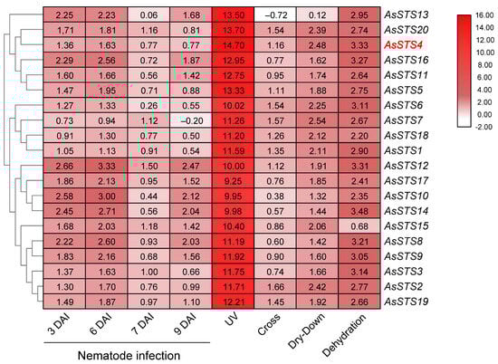 The expression profiles of A. stenosperma STS genes were subjected to heatmap construction by TBtools-II software 2.0 [67] using our previously produced transcriptome RNA-Seq data from plants submitted to different types of stresses: M. arenaria infection (at 3, 6, 7 and 9 DAI); UV exposure; moderate (dry-down) and severe (dehydration) drought treatments; and combined drought and nematode stresses (cross-stress) [36,63,69,70].