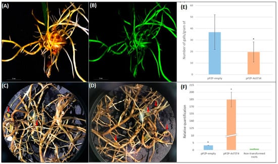 Peanut hairy roots transformed with A. rhizogenes harboring pPZP-AsSTS4 vector and observed under a stereomicroscope using bright field (A) and epifluorescence (B) 30 days after A. rhizogenes transformation. Transgenic peanut hairy roots transformed with pPZP- AsSTS4 (C) and pPZP-empty vectors (D), showing gall formation 60 days after M. arenaria inoculation. Mean number of galls per gram of transgenic hairy roots (E) and relative quantification of AsSTS4 gene in transgenic peanut hairy roots transformed with pPZP-empty, pPZP-ASSTS4, and in non-transformed control roots (F). Arrows indicate nematode galls. Error bars mean the standard error of samples, and asterisks mean significant differences between samples (p < 0.05; Student’s t-test).