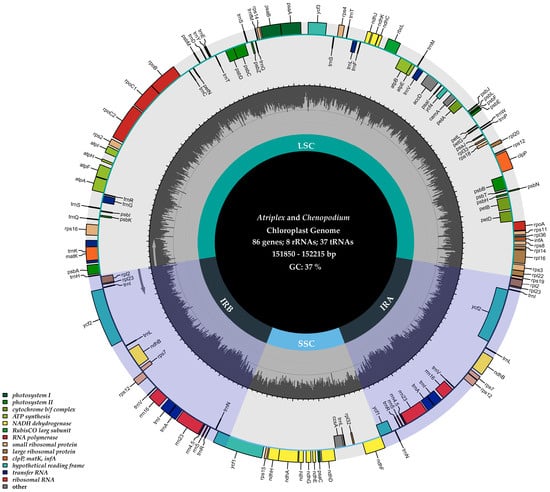 We sequenced and assembled the cp genomes of six Chenopodium species and related genera, and then compared these to the existing cp genomes of the associated genera in the NCBI database. The lengths of these newly sequenced cp genomes varied from 151,850 bp (A. patens) to 152,215 bp (A. prostrata). Both Chenopodium and Atriplex cp genomes presented a typical quadripartite structure (Figure 1). The IR region (varying from 25,161 bp (A. patens) to 25,192 bp (C. bryoniifolium)) were separated by a large single copy (LSC) region (ranging from 83,675 bp (C. bryoniifolium) to 83,887 bp (A. prostrata)) and an SSC region (ranging from 17,811 bp (A. patens) to 18,131 bp (C. berlandieri)). The overall GC content in the cp genomes of Chenopodium and Atriplex was found to range between 37.25% and 37.3%. Nevertheless, there was a non-uniform distribution of the GC content in distinct genomic regions. Precisely, the GC content within the IR region (42.72–42.81%) exceeded that of both the LSC (35.30–35.40%) and the SSC regions (30.82–31.02%), which is consistent with other Chenopodium and related species previously reported [,]. Several studies proposed that the elevated GC content observed in the IR region possibly stems from the higher prevalence of GC-rich genes, such as rRNA and tRNA, within these genomic sections [,,].