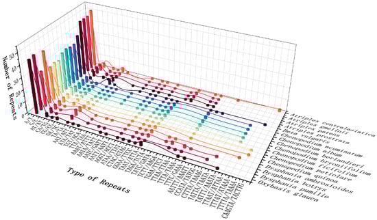SSRs with 1–6 bp repeat nucleotide units are widely distributed in plant cp genomes []. The number of SSRs in the 16 species of Chenopodium and related genera ranged from 44 (C. quinoa and C. petiolare) to 74 (A. centralasiatica). Except for pentanucleotide SSRs, which were not found in A. prostrata, A. patens, and A. gmelinii, all species contain mononucleotide, dinucleotide, trinucleotide, tetranucleotide, and pentanucleotide SSRs. However, hexanucleotide SSRs only exist in A. centralasiatica. Among all SSRs, A/T and AT/AT were the most abundant, accounting for 65.30% and 7.53% respectively. Research has demonstrated that a high AT content in the cp genome of higher plants is a prevalent phenomenon [,,]. SSRs were predominantly located within the intergenic spacer (IGS) of the LSC and SSC regions, with a smaller fraction being distributed within the coding regions of ycf1, ycf2, and rrn23 in the IR region (Figure 2).
