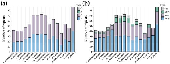 Interspersed repeats in the cp genomes of 16 Chenopodium and related species. (a) Number of 4 types of repeats. (b) Number of different repetition repeats.