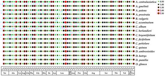 RSCU values of the chloroplast genomes of the 16 Chenopodium and related species. Red and green represent higher and lower RSCU values, respectively.