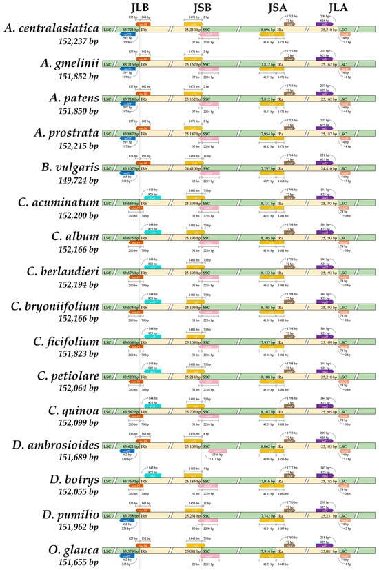 Comparison of the boundaries of the LSC, SSC, and IR regions among the 16 Chenopodium and related species.