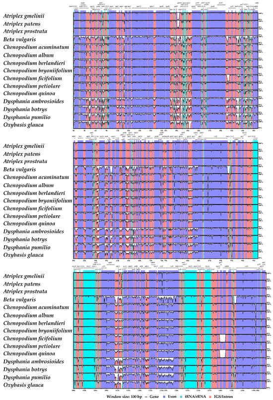 The Perl script CPJSdraw v1.0 was employed to compare and visualize the inverted repeat (IR) region boundary characteristics between the cp genomes of the 16 species of Chenopodium and its related genera []. Using A. centralasiatica as the reference genome, in the Shuffle-LAGAN model of mVISTA, the cp genomes were compared to understand the sequence variations among closely related species [,]. DnaSP v5.10 was employed to analyze the nucleotide diversity of 111 gene regions and 135 intergenic regions (including introns) shared by all closely related species to obtain high information content sites [].
