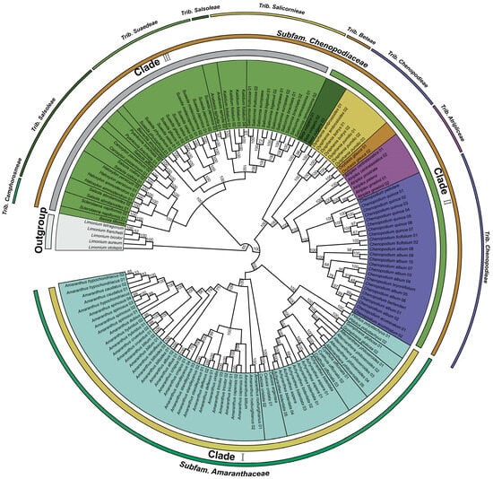 The cp genome plays a pivotal role in revealing the evolutionary relationships among plants []. Taking several species of Limonium as the outgroup, we reconstructed the phylogenetic trees of 63 species of Amaranthaceae, including Chenopodium (Table S2). The maximum likelihood (ML) trees and Bayesian inference (BI) trees had almost the same topological structure, with a strong bootstrap support (BS) and posterior probabilities (Figure 8). In the ingroup, all species were classified into three main clades (clade I, clade II, and clade III). Based on morphological studies (Flora of China), all species in clade I belong to Subfam. Amaranthaceae, while all species in clade II and clade III belong to Subfam. Chenopodiaceae. Among them, all the species in clade II are distributed in three tribes (Trib. Atripliceae, Trib. Beteae, and Trib. Chenopodieae), while the species in clade III are distributed in four other tribes (Trib. Camphorosmeae, Trib. Salicornieae, Trib. Salsoleae, and Trib. Suaedeae). In addition, all the species of Chenopodium and its four related genera (Atriplex, Beta, Dysphania, and Oxybasis) in clade II were clustered together as genera, forming five monophyletic groups. This result further supports the inference of other studies that Chenopodium is a monophyletic group [].