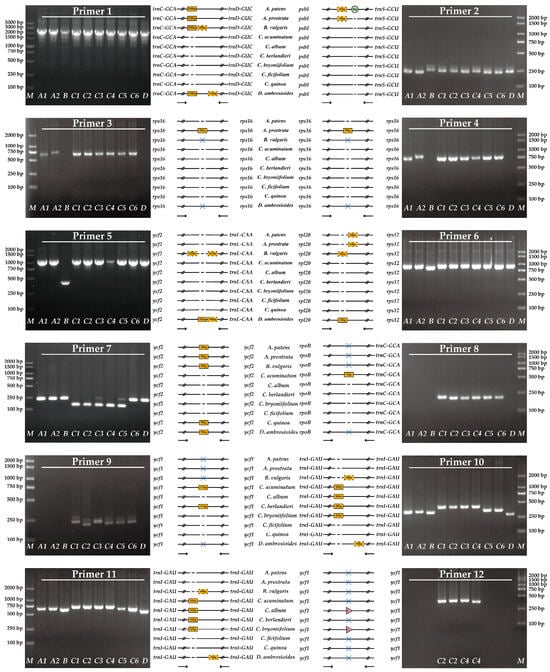 Based on the interspecific analysis, we designed a series of primers on the conserved region near the variant sites to amplify fragments with genetic marker information (Table S3). The results show that 12 pairs of primers could successfully amplify the expected polymorphic sequences and could completely distinguish 10 species of Chenopodium and related genera (Figure 10). Most of the primers were designed based on InDel markers. Among them, primers 1 and 2 can be used to distinguish Atriplex from other genus species, and primers 3 and 4 can further distinguish A. patens and A. prostrata. Primer 5 and primer 6 can be used to distinguish Beta species. Primer 7 can distinguish Chenopodium species, except for distinguishing C. quinoa from other species. Primer 8 can be used to distinguish C. acuminatum from other Chenopodium species, and primer 8 and primer 9 can further distinguish C. berlandieri. In addition to directly distinguishing D. ambrosioides, primers 10 and 11 can also distinguish C. ficifolium from other Chenopodium species. At the same time, the combination of primers 7 can further distinguish C. quinoa. Primer 12 is the only pair of primers based on dCAPs markers, which are more cumbersome than InDel markers. Because there are only two SNPs in the cp genome of C. album and C. bryoniifolium, we assembled and annotated their ITS sequences, but there was no difference after comparison.