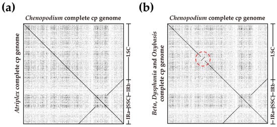 Dot plot of the inversions in the cp genomes of Beta, Dysphania, and Oxybasis. (a,b) represent the collinearity between Chenopodium and Atriplex, and between Chenopodium and Beta, Dysphania, Oxybasis, respectively. The interior of the red circle is the area where inversions occur.