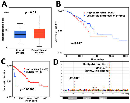 The effect of ARID4B expression and mutations on patient survival. (A) Expression of ARID4B is similar in patients with breast cancer compared with normal tissue, from GEPIA data. (B) High expression of ARID4B is associated with poor survival in patients with breast cancer from TCGA data. (C) Point mutations in ARID4B are associated with low survival in breast cancer patients using statistical analysis for unbalanced groups (VALORATE). (D) Hotspot found in the HotspotAnnotations database to be analyzed in further experiments.