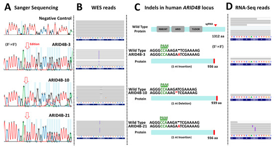Characterization of loss-of-function mutations in ARID4B. (A) The result of the Sanger sequencing showing altered electropherograms in the three clones previously validated by Surveyor assay. (B) Result of the WES analysis of the three clones. Clones ARID4B-3 and ARID4B-21 have an adenine insertion. On the other hand, clone ARID4B-10 has an adenine deletion. (C) Characterization of the effect of the mutations found in the three clones. Two of the clones (ARID4B-3 and ARID4B-21) alter the reading frame, producing a hypothetical truncated protein of 936 amino acids. Clone ARID4B-10 would produce a 939 amino acid truncated protein. (D) RNA-Seq reads showing that edited DNA have been transcribed in at least two clones (ARID4B-10 and ARID4B-21).