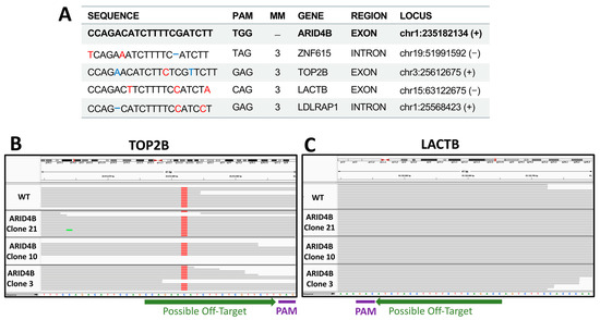 Off-targets validation. (A) Top possible off-target sequences. Red nucleotides mark mismatches with respect to the ARID4B sequence. Blue positions highlight insertions or deletions. Possible off-targets in exons are shown in B and C. (B) Exome sequencing of TOP2A possible off-target region in clones and wild-type cell lines. (C) Exome sequencing of LACTB possible off-target region in clones and wild-type cell line. No differences are observed relative to wild type (WT).
