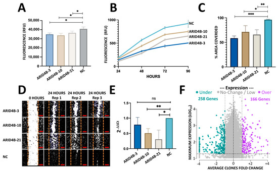 To evaluate whether ARID4B plays an essential role in cell migration, we assessed the wound-healing capacity of clones ARID4B-3, ARID4B-10, and ARID4B-21. Specifically, we imaged the area of the culture well that corresponded to the induced wound (which had been scratched with a pipet tip 24 h before imaging); then, we analyzed images using Image J and measured the percentage of area covered by each clone, relative to NC after 1 day of incubation. All three clones carrying mutations in ARID4B showed a decreased ability to migrate and cause “wound” closure, compared to NC (p < 0.05, Figure 5C,D). These results suggest that the presence of loss-of-function mutations in ARID4B is associated with lower migration rates in MCF-7 BC cells, potentially attenuating the metastatic capacity of BC cells.