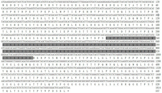 The expression of the PcFoxl2 gene in different tissues of P. clarkii was detected using an RT-PCR method. The results showed that the bands of the PcFoxl2 gene PCR amplification products were only found in the ovary and testis tissues during electrophoresis, with the testis tissue showing the brightest bands and the highest expression level (Figure 1). The expression of PcFoxl2 in ovarian tissue was the second highest, suggesting that PcFoxl2 may be related to the gonadal development of P. clarkii. The genome sequencing results for P. clarkii (NC_059599.1) published by GenBank showed that the total length of the PcFoxl2 gene is 5654 bp. However, according to the sequencing results and bioinformatics analysis of this study, the CDS sequence length of the PcFoxl2 gene is 1614 bp, encoding 537 amino acids. The predicted molecular weight of the protein was 58.8 kDa, and the theoretical isoelectric point was 6.72. The K228-R328 region was a forkhead (FH) domain unique to the Foxl2 gene family (Figure 2).