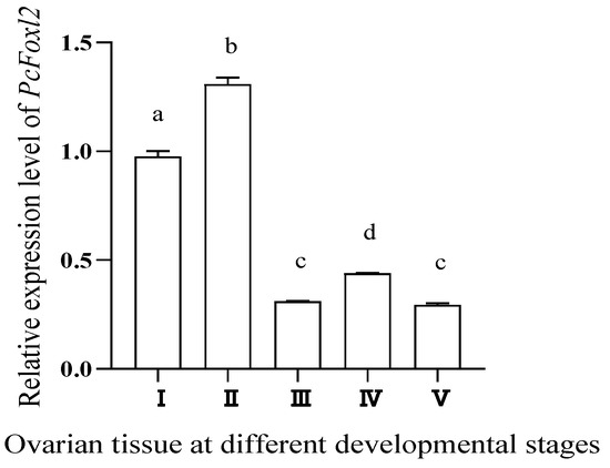 Expression of PcFoxl2 in ovarian tissues at different stages. Different letters indicate significant differences (p < 0.05).