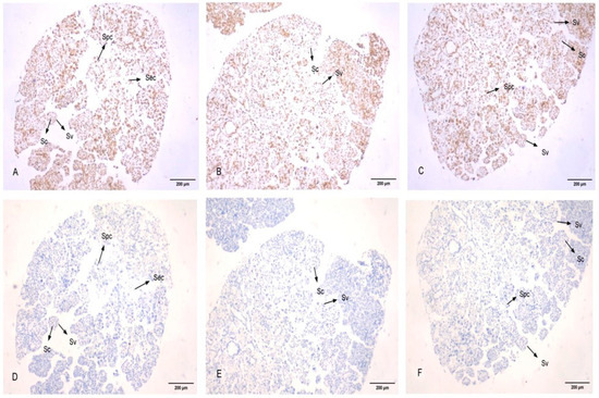 In situ hybridization of Foxl2 mRNA in the testis of P. clarkii. Yellow represents the positive signal and blue represents the nucleus. The figure shows the Spermatogonia cell (Sc), spermatocytes cell (Spc), sperm cells (Sec), and seminal vesicles (Sv). (A–C) show the results of in situ hybridization with the PcFoxl2 mRNA antisense probe, and (D–F) show the results of in situ hybridization with the PcFoxl2 mRNA sense probe.