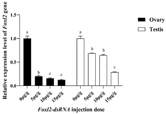Relative expression of the Foxl2 gene in P. clarkii under different dsRNA injection doses. Significantly different levels (p < 0.05) are denoted by different letters.