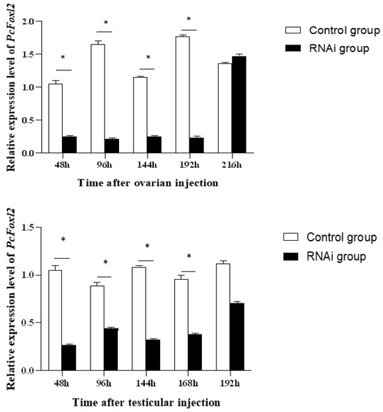 The effect duration of dsRAN interference on the Foxl2 gene in P. clarkii. * indicates extremely significant difference (p < 0.05).