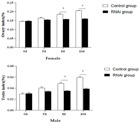 Ovarian index and testis index of P. clarkii at different times after Foxl2 gene interference. * indicates extremely significant difference (p < 0.05).