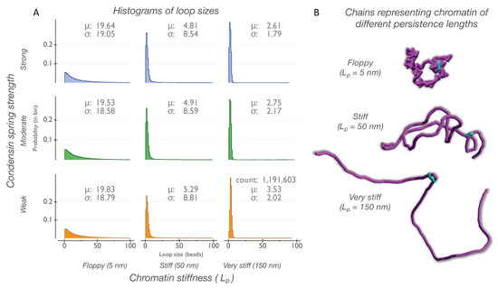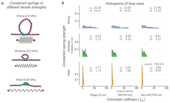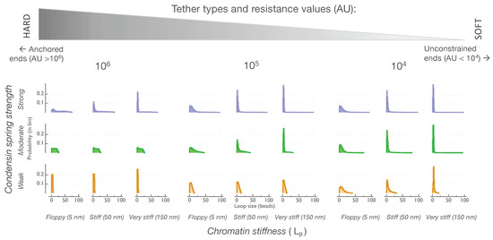 In the softer tethering regimes (Figure 4, tethering resistance of 104 AU), the size distributions of the loops formed by the strong, moderate, and weak condensin springs look strikingly similar to each other and are all differentially affected by the chromatin persistence length. At lower values (less than 104 AU) of tethering resistance, the loop size distribution histograms suggest that chromatin stiffness dominates the strength of the condensin crosslinker and emerges as the dominant physical parameter determining loop sizes (Figure S5).