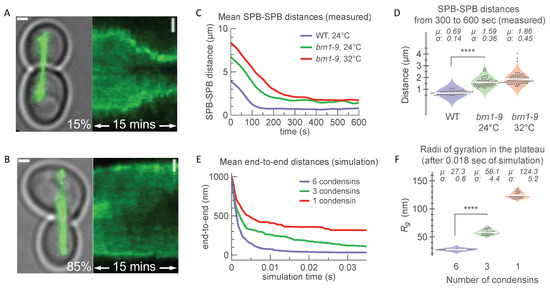 In vivo single-molecule experiment of spindle collapse via DNA recoil compared with collapse of one-micron DNA chain with simulated condensins. (A) Characteristic transillumination image of yeast cells in late-anaphase prior to SPB-SPB snapback (15% of events). Tubulin-GFP is shown, and spindle poles are dense signal clusters at distal ends. On the right, kymograph of GFP signal in mother and daughter cells is shown, where SPBs recoil from their original positions (on left, t = 0 min) toward the bud neck (on right, t = 15 min). (B) Same as above, showing t = 0 min cell snapshot and kymograph (0 ≤ t ≤ 15, in mins) in the absence of SPB-SPB snapback (85% of events). Scale bar for all images is 1 µm. (C) Mean distances between spindle pole bodies (SPBs) in snapback events measured over 10 min in wild-type dicentric (purple, N = 12) and brn1-9 dicentric strains at 24 °C (green, N = 10) and 32 °C (red, N = 14). (D) Violin plots with mean SPB-SPB distances post-snapback (i.e., average of 300 ≤ t ≤ 600, in seconds) for wild type at 24 °C (purple); brn1-9 mutants at 24 °C (permissive temperature, green; and brn1-9 mutants at 32 °C (sensitive temperature, red). Individual measurements collected every 30 s are grouped by condition (grey dots). Average distances and means are provided above. Comparison between WT and brn1-9 mutant dicentrics at 24 °C is shown significant by a single-factor ANOVA test (summarized in Data supplement file) as indicated by **** (p-value < 0.001). (E,F) Simulations of condensin springs on one-micron chain. (E) Reduction in condensin number (from 6 to 1) increases the end-to-end distance trajectories and the rate of chain collapse, and (F) the final volume (Rg, radii of gyration) of the chain. Simulation time of 35 ms equals to approximately 8 min of microscopic measurement time (see Table 2). Data for trajectories in (E) are averages of independent randomly seeded simulations (N = 20) with 6 condensins (purple), 3 condensins (green), and 1 condensin (red) on Lp = 50 nm chains whose ends are tethered, providing a drag with resistance value of 104 AU (see example of single instantiation with one condensin spring in Supplementary Movie SM5). Data for (F) are values from (N = 42) observations taken at regular time intervals within the plateau regions for each group (0.018 ≤ time ≤ 0.032, simulation seconds). Comparison between 6 and 3 simulated condensins is shown significant by a single-factor ANOVA test (summarized in Data supplement file) as indicated by **** (p-value < 0.001).