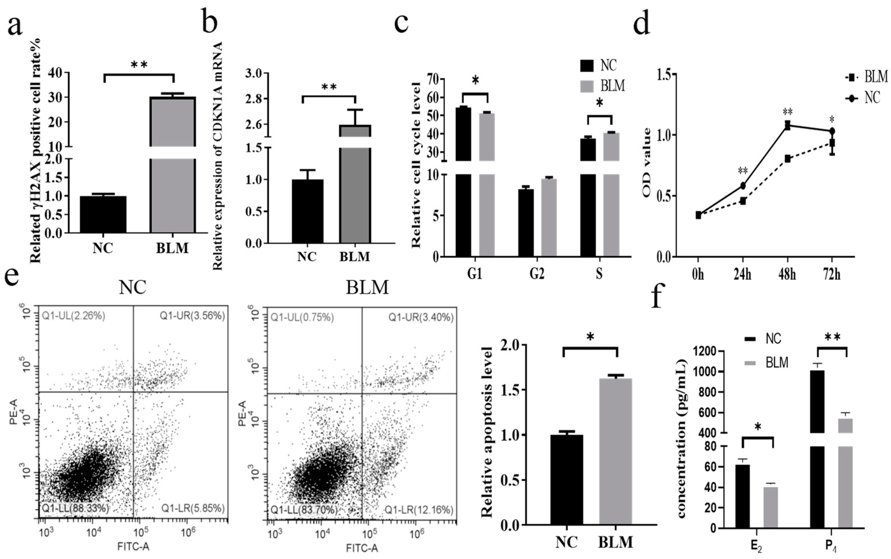 3.2. Effect of CDKN1A on DNA Damage and Steroid Hormone Secretion in Bovine Cumulus Cells