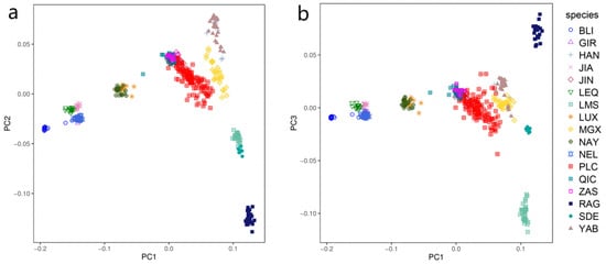 Principal component analysis of 443 individuals from 17 cattle populations: (a) PC1 and PC2 results of principal component analysis; (b) PC1 against PC3.