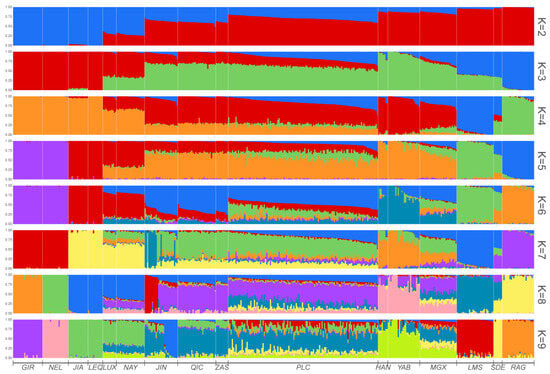 - Pritchard, J.K.; Stephens, M.; Donnelly, P. Inference of population structure using multilocus genotype data. Genetics 2000, 155, 945–959. [Google Scholar] [CrossRef]