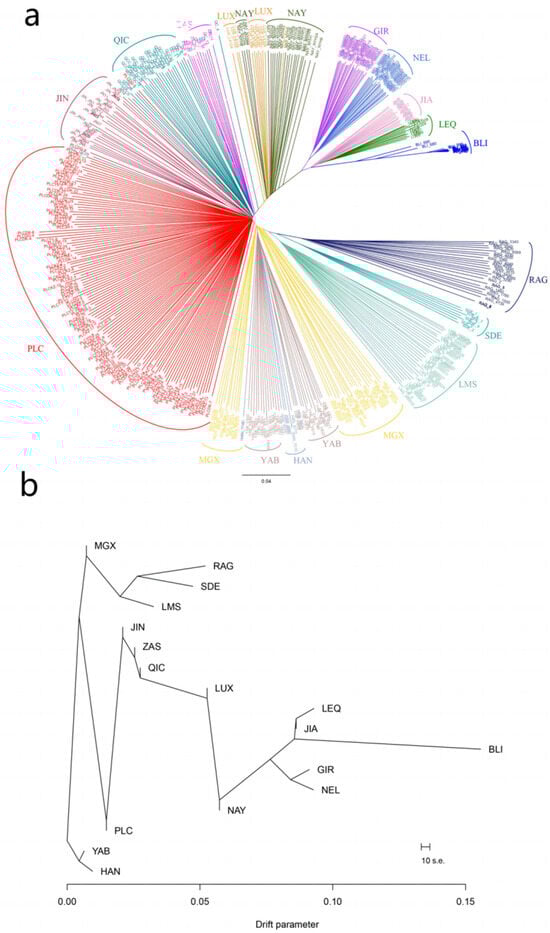 The genetic distance between the pairwise combination of individuals was estimated using Plink v1.9 with the “-distance-matrix” option, and a neighbor-joining phylogenetic tree was constructed using PHYLIP v3.69 [8]. The resulting phylogenetic tree was visualized with Figtree 1.3.1. In the analysis, Banteng (B. javanicus) was used as an outgroup, as previously described [25,26]. To further investigate the population-level phylogenetic relationships between Pingliang red cattle and other groups, a population-based maximum-likelihood (ML) phylogenetic tree comprising 17 cattle populations was constructed using Treemix with parameters set to “-k 1000 -global” [27].