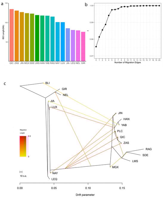 Introgression pattern of Pingliang red cattle: (a) the length of the shared haplotype lineage (IBD) fragment between Pingliang red cattle and other breeds; (b) f-value analysis of the optimal migration model among 17 cattle populations; (c) optimal population migration model inferred using Treemix software v. 1.13 (m = 11).