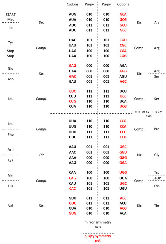The novel result is that the SSyGC table deduces codons on the binary code with A, G purines as “0” and U, C pyrimidines as “1”, and has the unique physicochemical purine–pyrimidine symmetry net with double vertical and horizontal mirror symmetry (Figure 1b). The purine–pyrimidine symmetry net is common for all RNA and DNA living species. It is also common for all more than thirty nuclear and mitochondrial genetic codes. It is important to point out that the purine–pyrimidine symmetry net has remained unchanged during all of evolution [6,7].